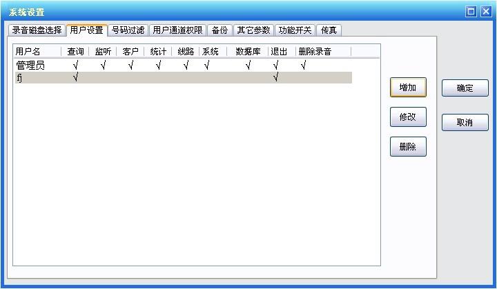 錄音系統(tǒng)默認(rèn)用戶為管理員,你也可以任意增加用戶,并對該用戶授權(quán)查詢,監(jiān)聽,統(tǒng)計,刪除錄音,退出等功能。