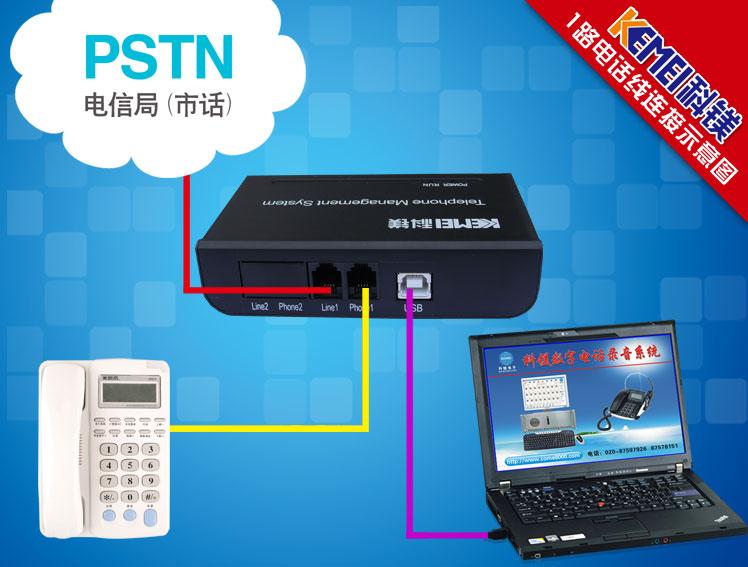 COME800-R01電話錄音系統(tǒng),硬件通過電腦的USB接口連接,將通話錄音和來電去電號碼保存在電腦的硬盤上,結(jié)合相應(yīng)的軟件,實現(xiàn)各種錄音查詢功能,錄音盒與電腦的連接示意圖如下: